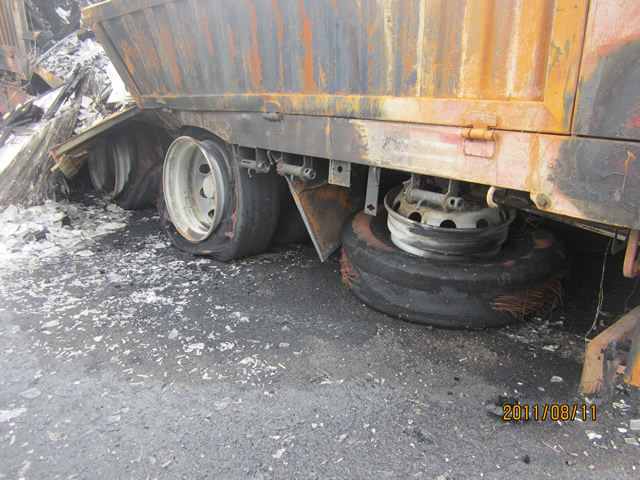 出险原因:轮胎突然自燃,导致车上货物80%烧毁;